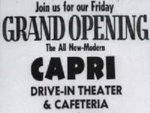 From 1964 through 1977, The Capri served the residents of Branch and Calhoun counties. The 50's, 60's and 70's were boom times for Drive-in's. In Michigan, there were 87 open Drive-In's in 1954, growing to a peak of 110 in 1958. The number of open Drive-In's remained constant over the next 20 years, with 103 Drive-In's still open in Michigan in 1977.